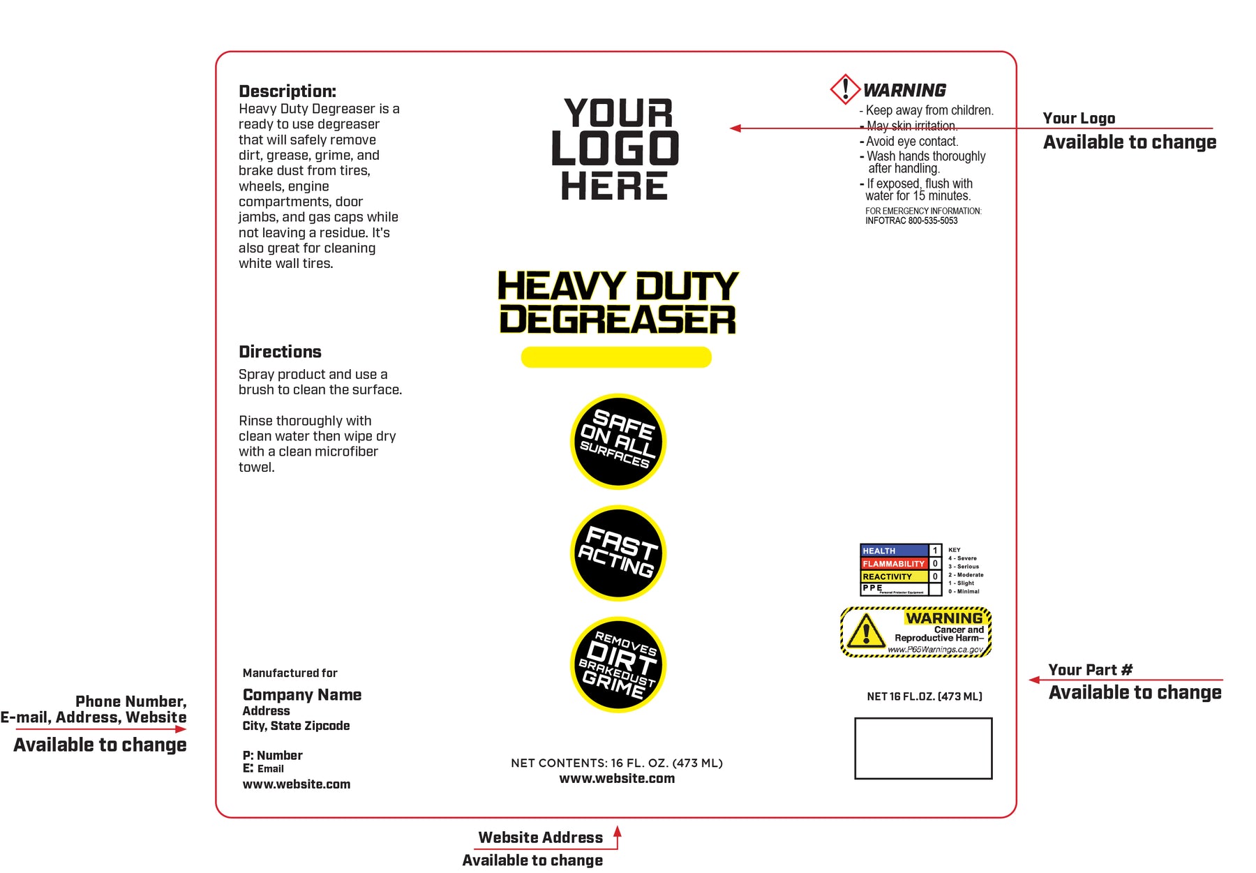 On this product, as with all of our private label automotive chemical products, you can customize the logo, part #, website, phone number, product description and instructions. That being said we find most people customize the phone number, part #, website & logo and usually stick with our product description and instructions.