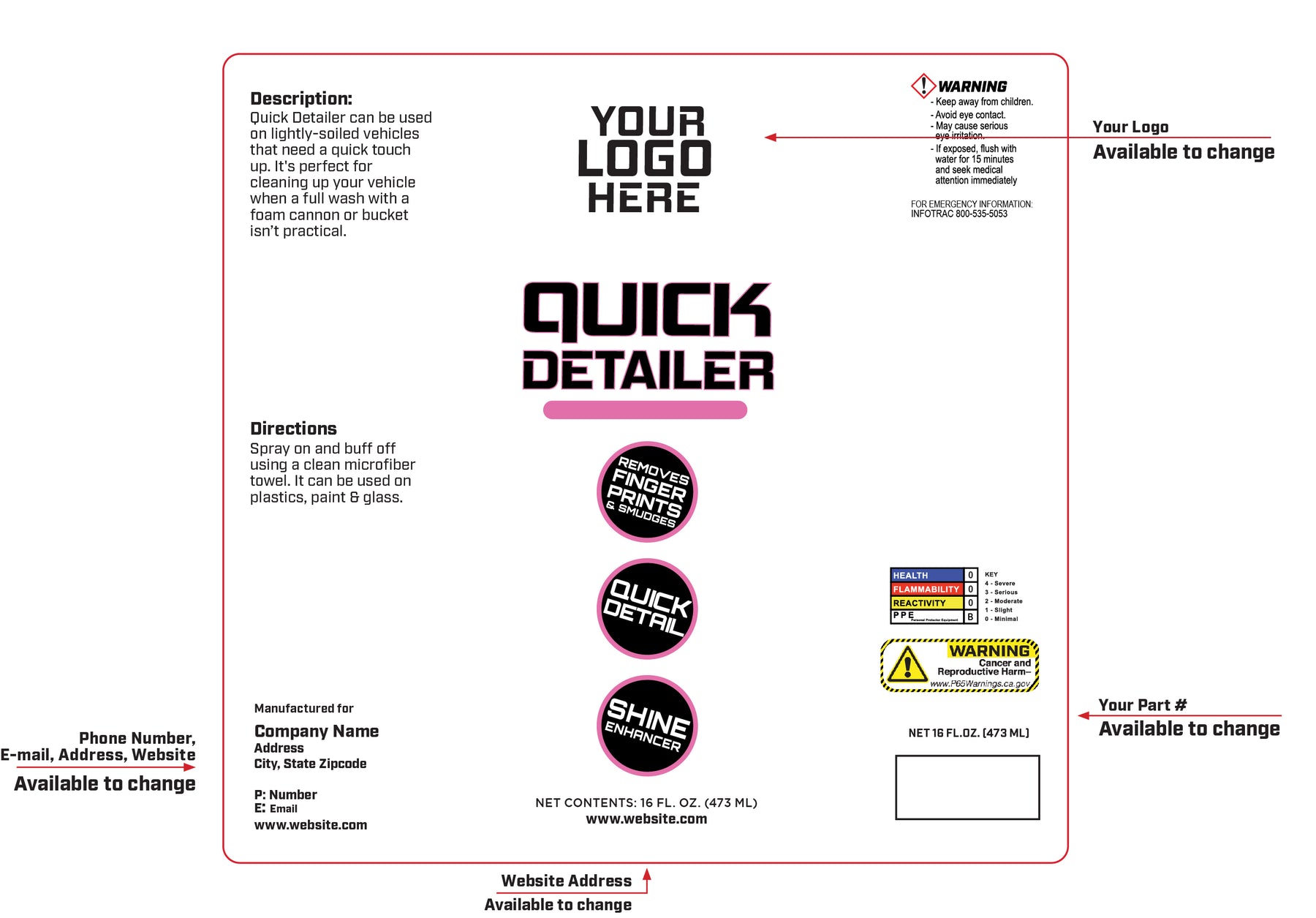 You can create your own custom ceramic quick detailer product with your own company logo & information on the label or bottle with an order as small as 60 bottles. White labeling a ceramic detail product has never been easier due to how affordable it is and the low minimums. When you reach the 440 bottle mark of 16 oz bottles we even allow you to choose your very own scent and color.